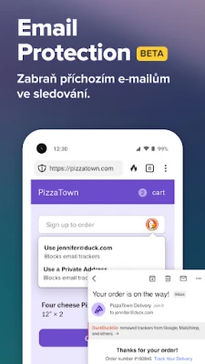 Ochrana vašeho soukromí s DuckDuckGo nekončí jen u prohlížeče. Naše inovativní funkce ochrany e-mailů (beta) vám umožní eliminovat drtivou většinu trackerů obsažených v e-mailech, aniž byste museli měnit svou e-mailovou adresu. Navíc skrývá vaši skutečnou adresu při registraci k online službám. Ještě dál jde ochrana před sledováním aplikacemi (App Tracking Protection), která identifikuje a blokuje skryté trackery v jiných aplikacích na vašem zařízení, čímž chrání vaše citlivá data před zvědavými třetími stranami. Automaticky také vyžadujeme šifrované připojení (HTTPS) na mnoha webech, abychom zajistili, že vaše komunikace zůstane v bezpečí před poskytovateli internetu a jinými slídily.