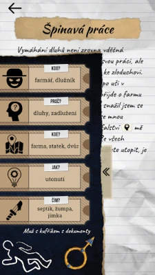 Ponořte se do hlubin neobjasněných zločinů a odhalte skrytá tajemství vražd. Představujeme doprovodnou aplikaci, která oživuje vaši deskovou hru a přináší nekonečné hodiny detektivní zábavy. Jeden z vás se stane duchem oběti, který zná veškeré detaily hrůzného činu – vraha, místo, motiv, způsob i nástroj. Ostatní hráči, paranormální detektivové, se s pomocí asymetrických balíčků interakčních karet a svého důvtipu pustí do výslechu posmrtného svědka, aby rozklíčovali pravdu. Každý případ je unikátní výzvou, kde pouze správně položené otázky vedou k odhalení pachatele.