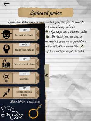 Ponořte se do hlubin neobjasněných zločinů a odhalte skrytá tajemství vražd. Představujeme doprovodnou aplikaci, která oživuje vaši deskovou hru a přináší nekonečné hodiny detektivní zábavy. Jeden z vás se stane duchem oběti, který zná veškeré detaily hrůzného činu – vraha, místo, motiv, způsob i nástroj. Ostatní hráči, paranormální detektivové, se s pomocí asymetrických balíčků interakčních karet a svého důvtipu pustí do výslechu posmrtného svědka, aby rozklíčovali pravdu. Každý případ je unikátní výzvou, kde pouze správně položené otázky vedou k odhalení pachatele.