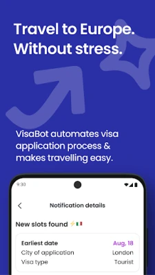 VisaBot zjednodušuje podávání žádostí o cestovní víza. Rozlučte se s únavným nekonečným procházením webových stránek vízových center. VisaBot usnadní vaši cestu k získání schengenského víza, rychleji a snadněji než kdy předtím. Uživatelé ho hodnotí 4.8 hvězdičkami.